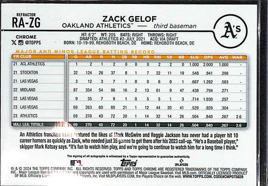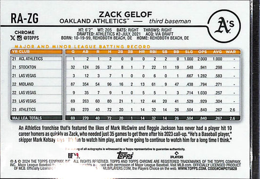 Zack Gelof 2024 Topps Chrome Auto RA-ZG Athletics