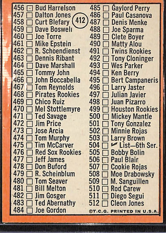1969 Topps Checklist 5th Series Mickey Mantle #412 Yankees