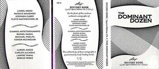 2025 Leaf - History Book - Sports - Dominant Dozen - Messi - Mahomes - Curry - Mayweather Jr - Giannis - Nadal - Phelps - McGregor - Judge - Alcaraz - Yamal - Perez - 1/3 - #DD-8 - soccer - football - basketball - tennis - UFC - baseball - Formula 1